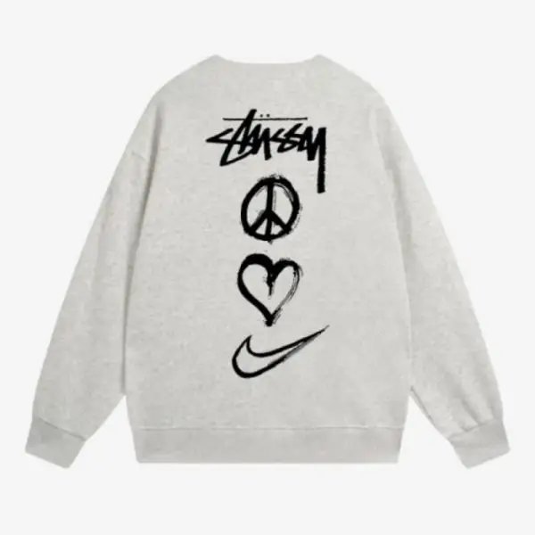 The “Peace, Love, Swoosh” theme is a nod to Stussy’s roots in social and counter-culture movements, bringing a unifying, positive message to the world of sportswear. This piece is more than just clothing; it is a wearable statement of solidarity and laid-back positivity, making the Nike X Stussy Peace Love Swoosh Grey Crew a popular and highly sought-after item for collectors and fashion enthusiasts alike.