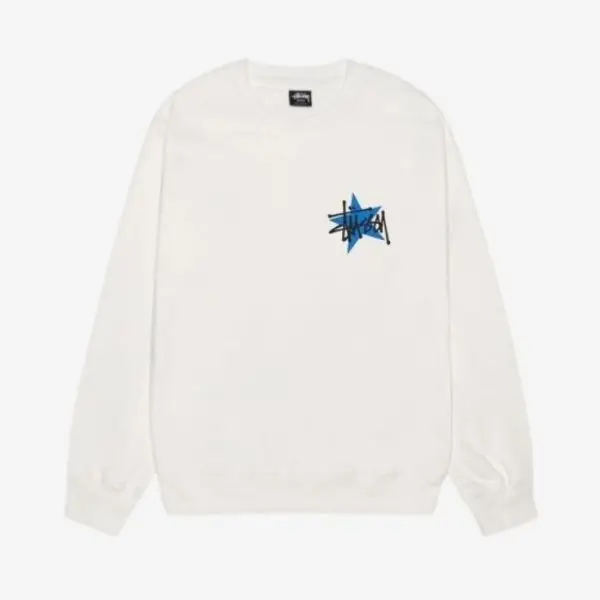 The Stüssy Star Crew in White (or a similar off-white/natural color) is a popular and less common graphic crewneck from the brand. Similar to the black version, this piece has appeared in a few variations, most notably as a knit sweater.