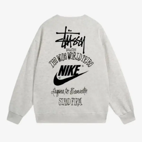 • Back Graphic: A large, circular graphic containing text like “Stüssy”, “Nike”, and “The Wide World Tribe”.